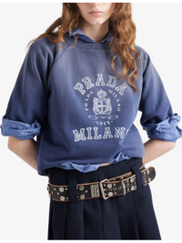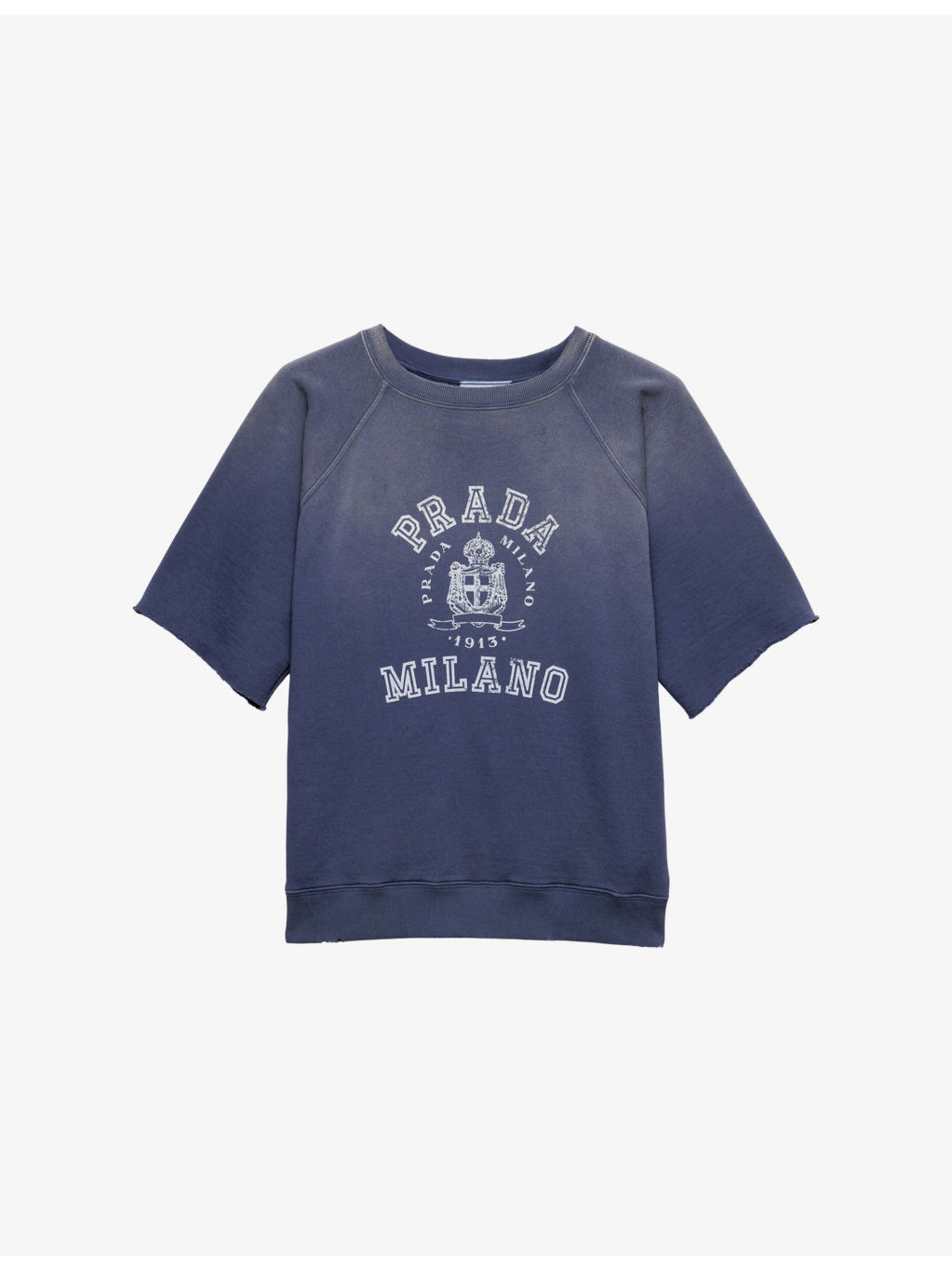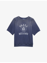 PRODUCT DETAILS - Prada cotton-jersey T-shirt - 100% cotton - Relaxed fit, crewneck, dropped shoulders, short sleeves, logo print at front, knit triangle applique at back, faded wash - Machine wash cold - Model is 5ft 10in/1.78m and wears a size UK 8 - Lightweight, slight stretch Ref: R04439468