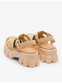 PRODUCT DETAILS - Prada crochet and rubber heeled sandals - 100% viscose - Buckle fastening - Raffia-effect yarn, crochet workmanship, metal buckle, enamelled metal triangle logo, rubber tread sole - Heel height 55mm - Wipe with a clean, dry cloth Ref: R04301721