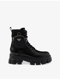 PRODUCT DETAILS - Prada Leather And Re Nylon Combat Boots - 100% leather; 100% polyamide - Zip fastening - Closed round toe, mid rise, removable pouch with enameled metal triangle logo, leather lining, Prada Milano logo on tongue, lug tread, removable leather-covered insole - Upper: 100% leather - Lining: 100% leather - Sole: 100% rubber - Please note, we are unable to accept in-store returns on Prada orders Ref: R04459080