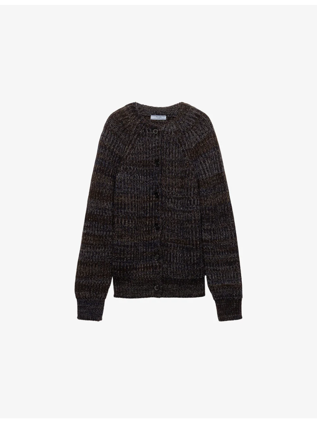 PRODUCT DETAILS - Prada wool and cashmere-blend cardigan - 70% virgin wool, 30% cashmere - Exposed button fastening at front - Oversized fit, V-neck, long sleeves, dropped shoulders, all-over mouline texture, ribbed knit, knitted triangle branding at back - Dry clean - True to size - Midweight, non-stretch Ref: R04534019