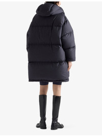 PRODUCT DETAILS - Prada shell-down jacket - 100% polyamide; padding 100% down - Exposed pressed stud and concealed zip fastening at front - Oversized fit, drawstring hood, long sleeves, two side flap pockets, triangle logo embroidered at chest, silver-toned hardware, quilted and padded - Dry clean - Made in Italy - True to size - Midweight, non-stretch Ref: R04522465