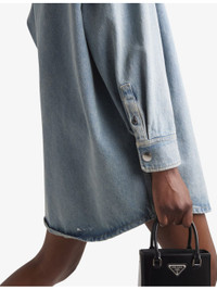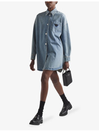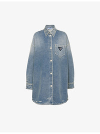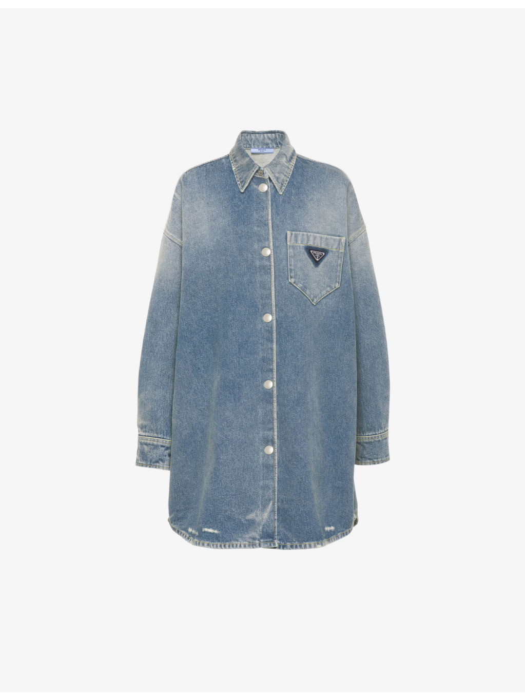 PRODUCT DETAILS - Prada organic-cotton denim shirt - 100% organic-cotton - Button fastening - Spread collar - Spread collar, long sleeves, oversized fit, long design, exposed button fastening at front, buttoned cuts, enamelled logo plaque at chest, one chest pocket, silver-toned hardware, curved hem, vintage treatment, contrast stitching - Dry clean - True to size - Midweight, non-stretch Ref: R04321955