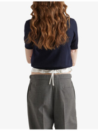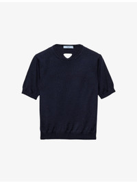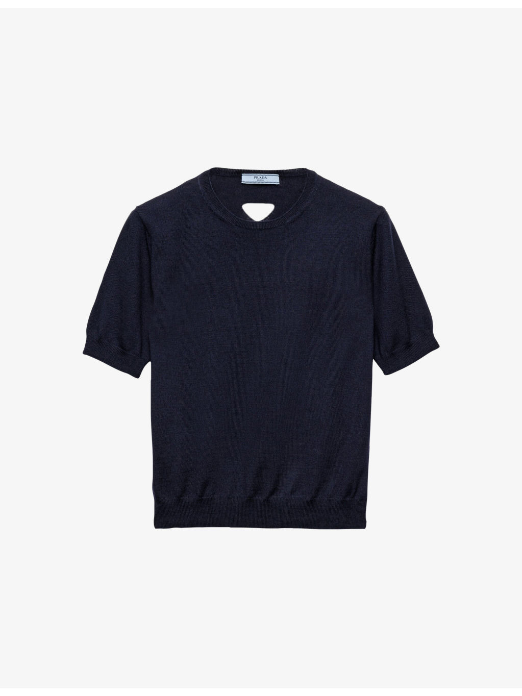 PRODUCT DETAILS - Prada wool jumper - 100% wool - Slips on - Boxy fit, round neck, short sleeves, ribbed trims, knitted triangle logo at back - Dry clean - True to size - Midweight, stretchy Ref: R04442803