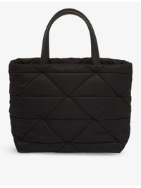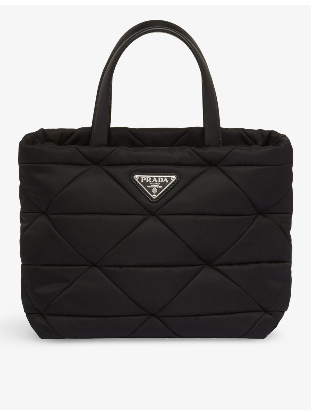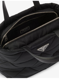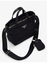 PRODUCT DETAILS - Prada Re-Nylon tote bag - 100% recycled polyamide - Zip fastening - All-over triangle quilted, all-over padded, enamelled metal brand plaque, silver-toned metal hardware, two nappa-leather top handles, detachable adjustable logo-print shoulder strap with detachable zipped pouch, zipped interior slip pocket, single inside compartment - Height 21cm, width 24cm, depth 13cm, shoulder strap 95cm - Sponge clean - Made in Italy Ref: R04268281