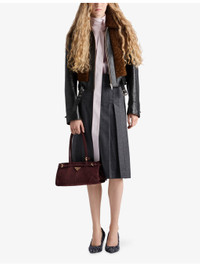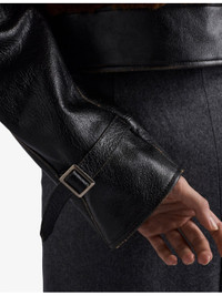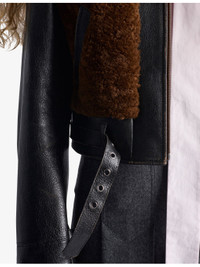 PRODUCT DETAILS - Prada leather and shearling jacket - 50% goat leather, 50% wool - Exposed zip fastening at front - Regular fit, high collar, long sleeves, buckled cuffs, silver-toned hardware, triangle logo sewn at back, two side zip pockets, buckled strap at waist, panelled design - Specialist leather clean - True to size - Midweight, non-stretch Ref: R04509969