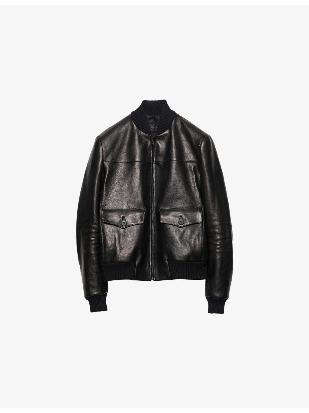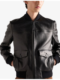PRODUCT DETAILS - Prada leather bomber jacket - 100% leather - Zip fastening - Regular fit, knit collar, straight sleeves and knit cuffs, pockets with flap and button, hem with knit trim, leather triangle logo on the back, final waxing treatment, lined garment - Model is 6ft 2in/1.88m and wears a size UK 38 - Midweight, non-stretch - Please note, we are unable to accept in-store returns on Prada orders Ref: R04523720