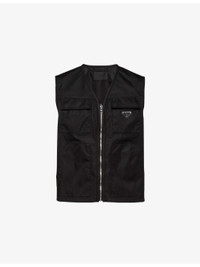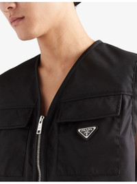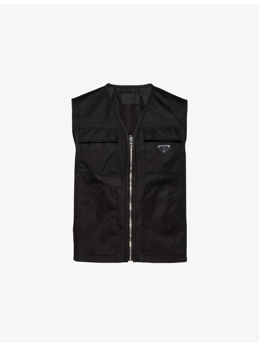 PRODUCT DETAILS - Prada nylon vest - 100% polyamide - Exposed zip fastening at front - Regular fit, V-neck, sleeveless, two flap pockets at chest, enamelled metal brand plaque at chest pocket, two slanted patch pockets at front, unlined - Dry clean - Model is 6ft 2in/1.88m and wears a size UK 38 - Lightweight, non-stretch Ref: R04461398