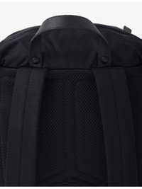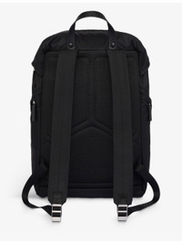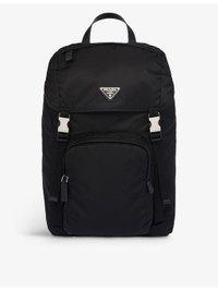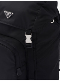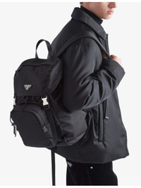 PRODUCT DETAILS - Prada recycled-polyamide and saffiano leather backpack - 100% recycled polyamide, 100% leather, 100% solvent-free resin - Push-lock clasp fastening - Leather handle, adjustable woven nylon straps, metal triangle logo on flap, four external zip pockets, padded mesh fabric back, interior with zip pocket and patch pocket, Re-Nylon lining - Height 45cm, width 27cm, length 17cm - Wipe with a clean, dry cloth - Made in Italy Ref: R04268230