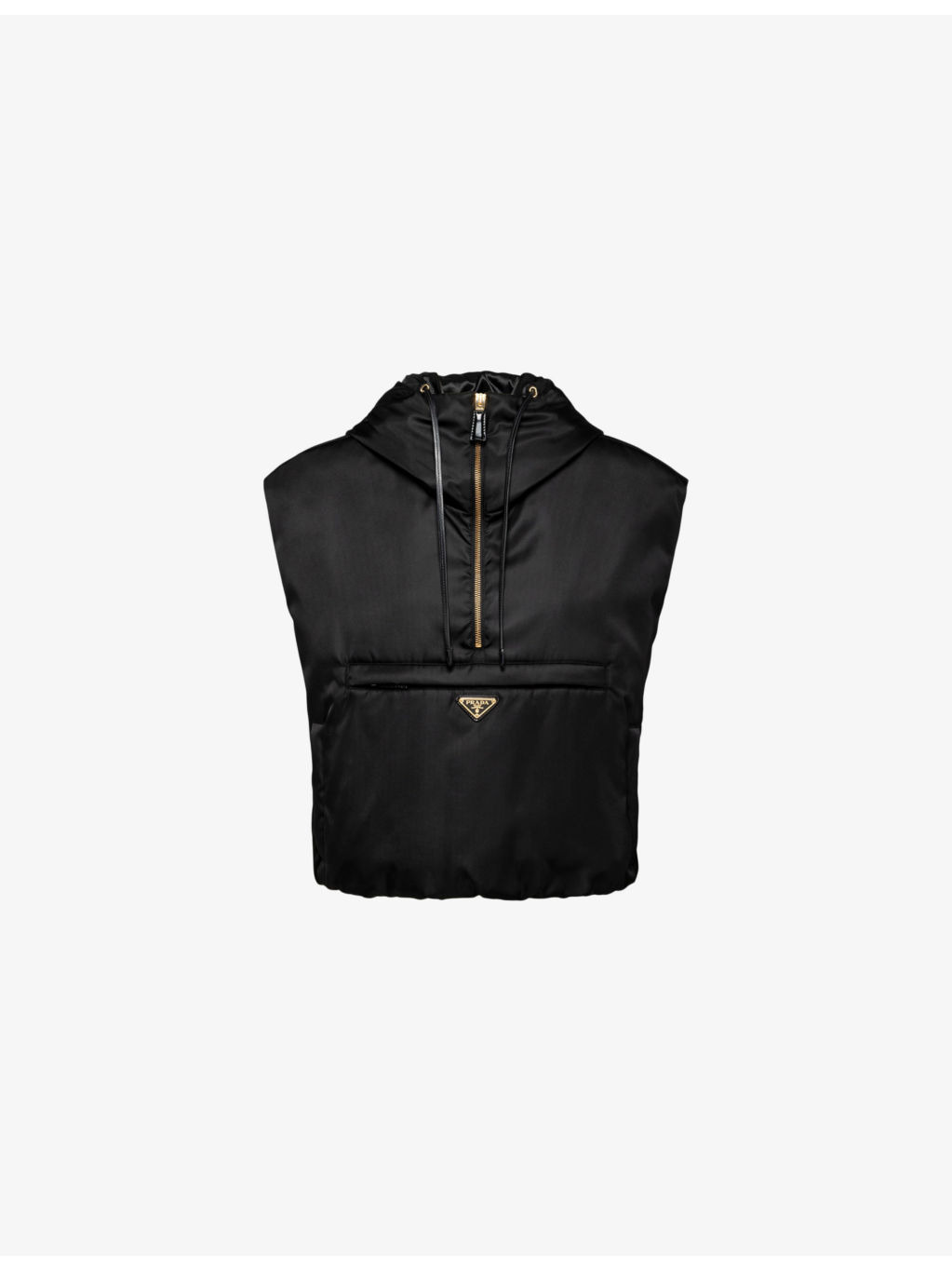 PRODUCT DETAILS - Prada Re-Nylon woven vest - 100% recycled polyamide - Zip fastening - Brand plaque, gold-tone hardware, padded lining, hooded, welt zip pockets, drawstring hem, logo-print leather zip pulls, leather drawstring on hood - Made in Italy - Midweight, non-stretch Ref: R04268040