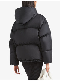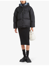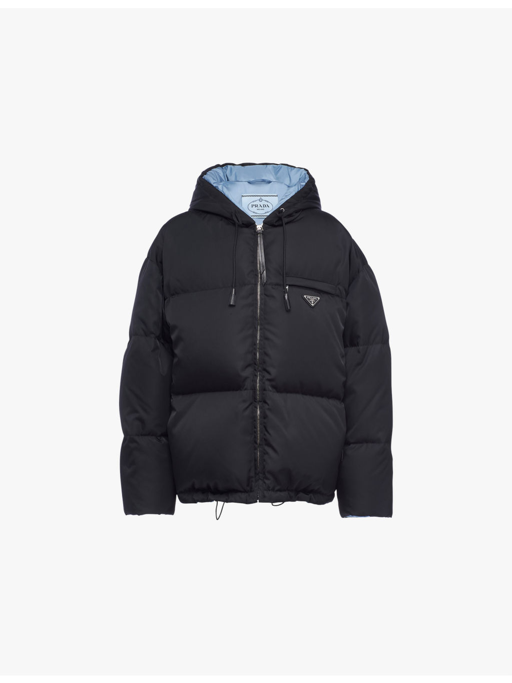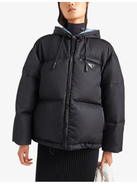 PRODUCT DETAILS - Prada recycled shell-down jacket - 100% recycled polyamide; padding 90% down, 10% feathers - Zip fastening - Oversized fit, drawstring hood, long sleeves, quilted, padded, enamelled metal triangle brand plaque to the chest, zipped pockets to the chest and sides, drawstring hem - Dry clean - True to size - Midweight, non-stretch Ref: R04301731