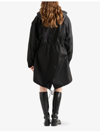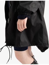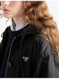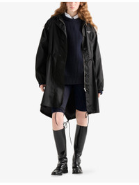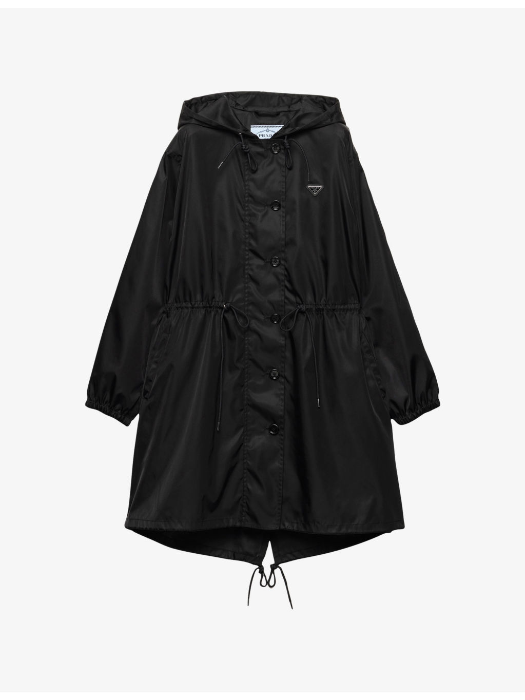 PRODUCT DETAILS - Prada woven raincoat - 100% polyamide - Zip fastening - Parka fit, unlined garment, drawstring hood, long sleeves, elastic cuffs, welt pockets, enameled metal triangle logo, zip closure with buttons, drawstring at the waist and hem - Model is 5ft 10in/1.78m and wears a size UK 8 - Lightweight, non-stretch - Please note, we are unable to accept in-store returns on Prada orders Ref: R04523719