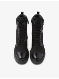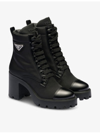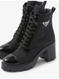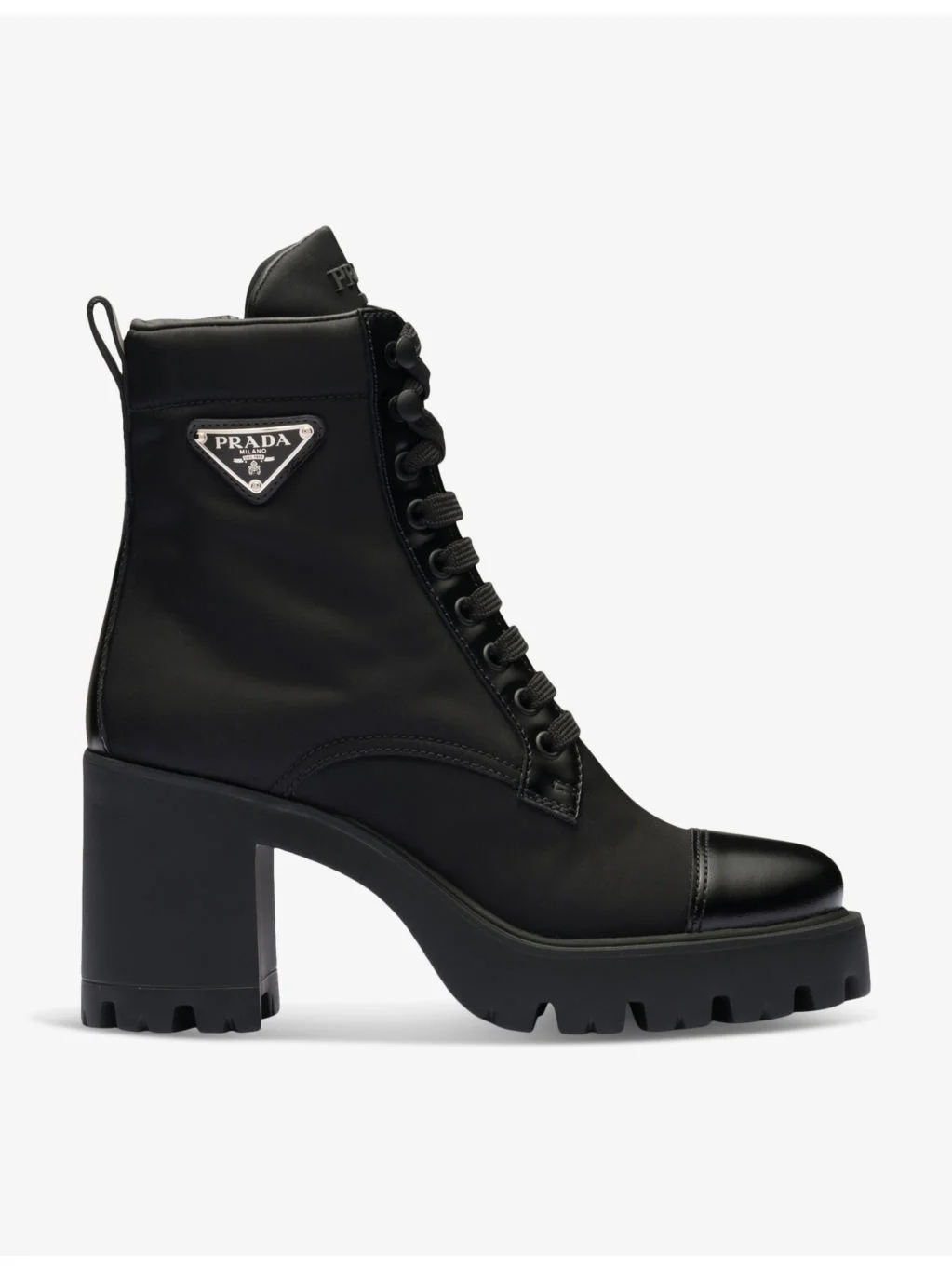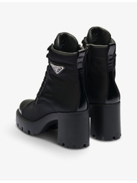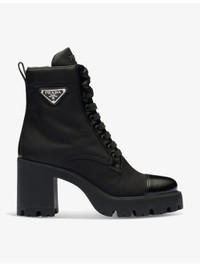 PRODUCT DETAILS - Prada leather and recycled-nylon heeled boots - 100% leather, 100% recycled polyamide - Lace-up fastening - Close round toe, enamelled logo plaque, tonal panels, chunky heel and outsole - Specialist leather clean - Heel height: 84mm / 3.4"" - Made in Italy - Upper: 100% leather, 100% recycled polyamide - Lining: 100% leather - Sole: 100% rubber