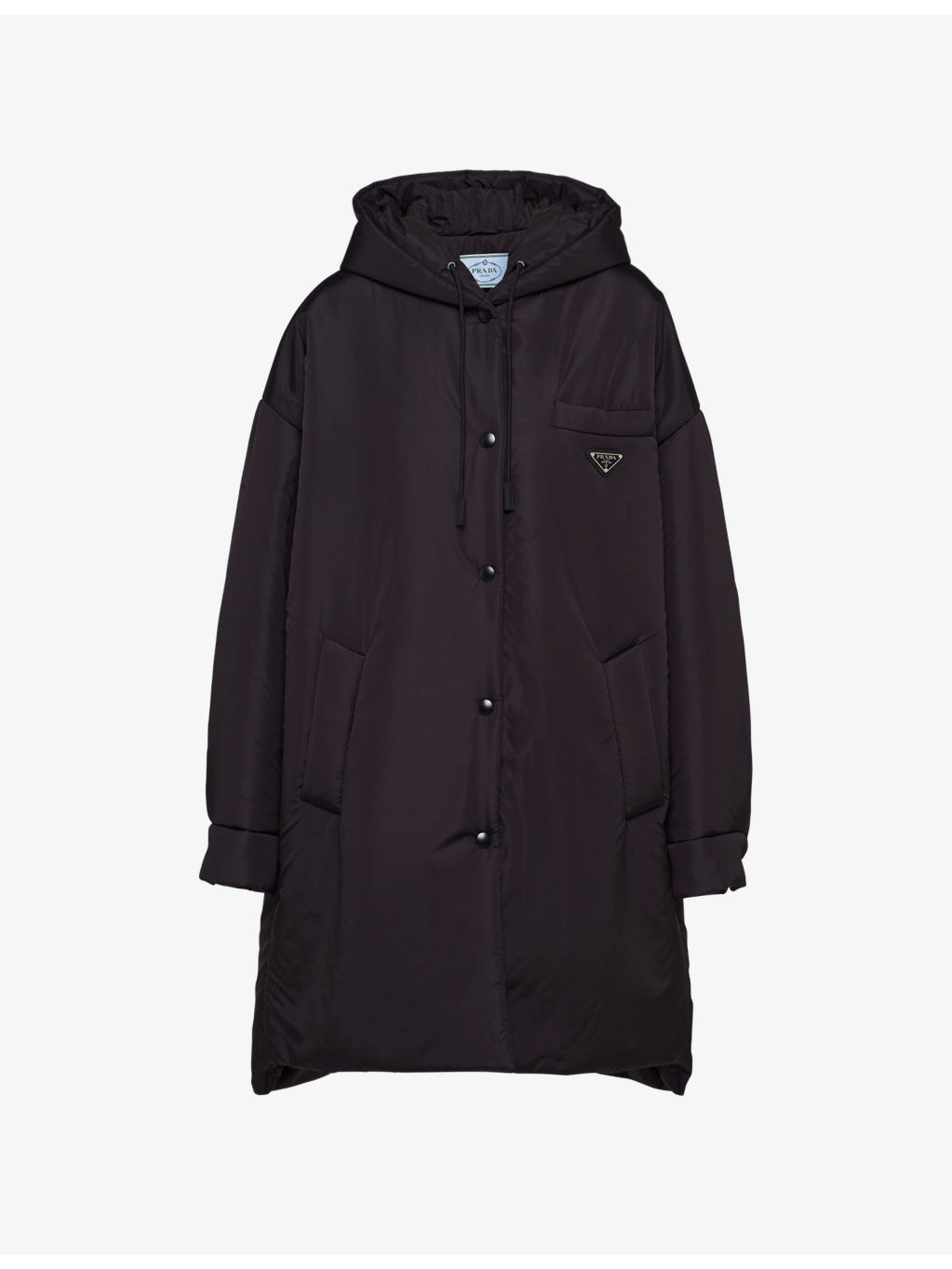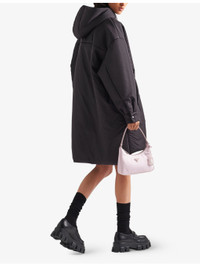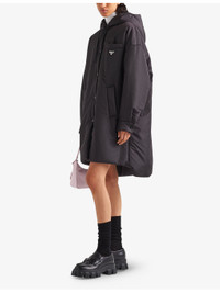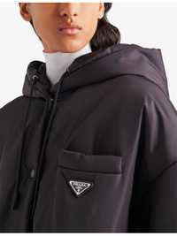 PRODUCT DETAILS - Prada Re-Nylon raincoat - 100% recycled nylon - Button fastening - Oversized fit, hooded, long sleeves, buttoned cuffs, embroidered logo, pockets at the side, drawstrings with fabric tips, welt pockets, lined - Specialist dry clean - Made in Italy - Midweight, non-stretch Ref: R04317292