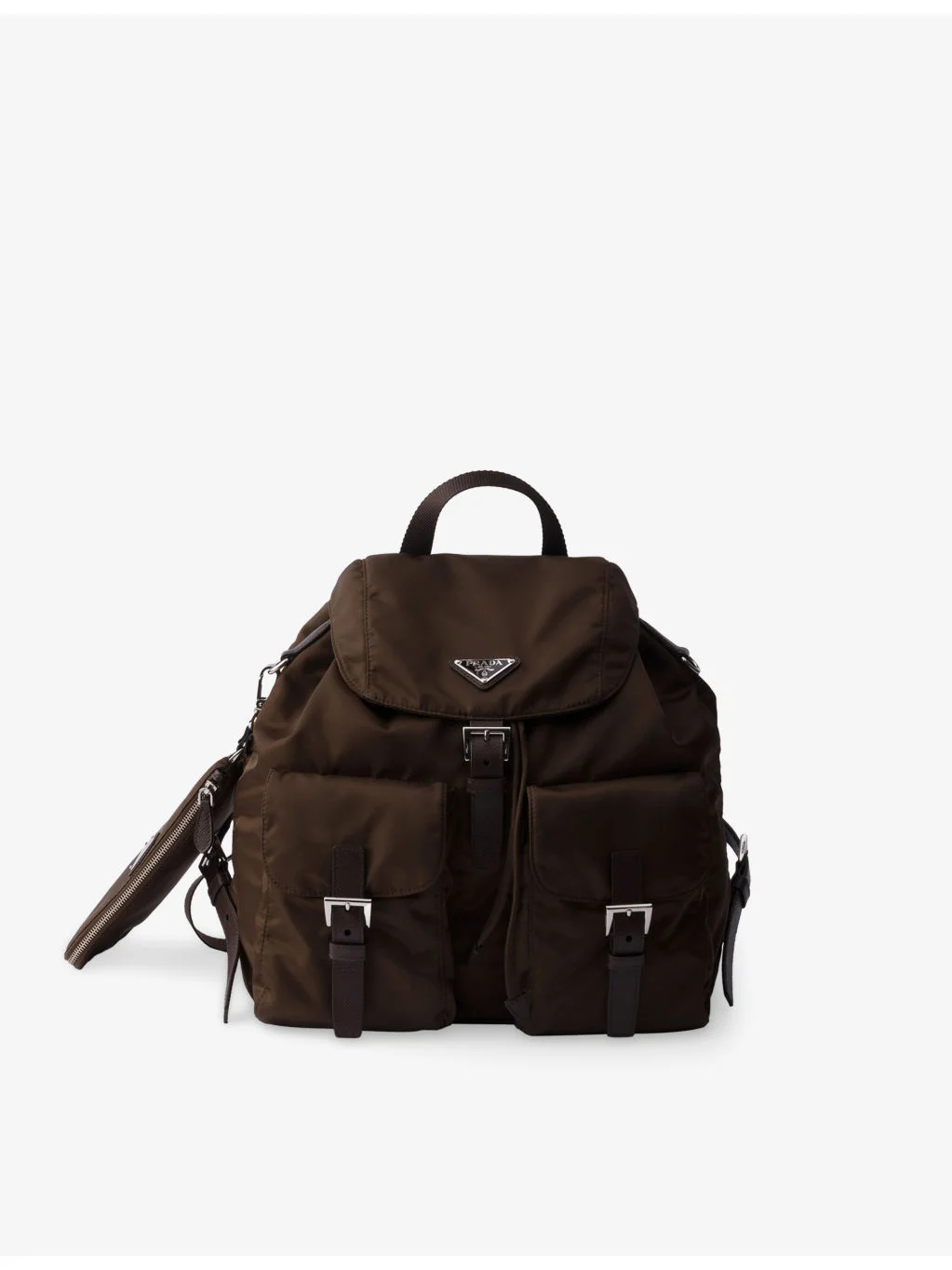 PRODUCT DETAILS - Prada woven backpack - 100% polyamide - Adjustable buckle fastening - Top handle, two adjustable shoulder straps, drawstring closure, front flap, two front pockets with flap and buckle closure, interior zipped pocket, enamelled triangle logo on front, silver-toned hardware - Height 32cm, width 30cm, length 15cm - Wipe with a clean, dry cloth Ref: R04539200