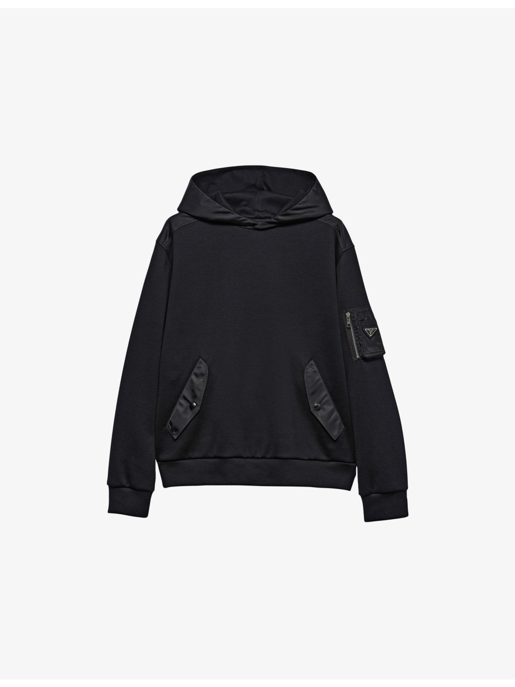 PRODUCT DETAILS - Prada cotton-jersey hoody - 100% cotton - Pulls on - Regular fit, hood, long sleeves, zip pocket with enamelled logo at sleeve, ribbed trims - Machine wash cold - Model is 6ft 2in/1.88m and wears a size medium - Midweight, slight stretch Ref: R04425886
