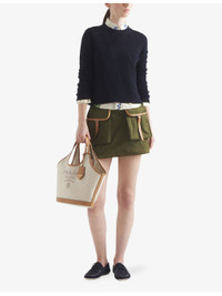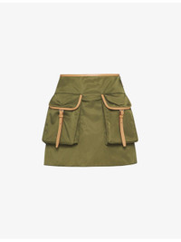 PRODUCT DETAILS - Prada recycled-nylon mini skirt - 100% recycled nylon; trims 100% leather - Exposed zip fastening at side - Regular fit, mid-rise, leather trims, buckle-fastened patch pockets at front, silver-toned hardware, enamelled triangle logo at back, unlined - Specialist dry clean only - Made in Italy - True to size - Model is 5ft 10in/1.78m and wears a size UK 8 - Midweight, non-stretch Ref: R04310783