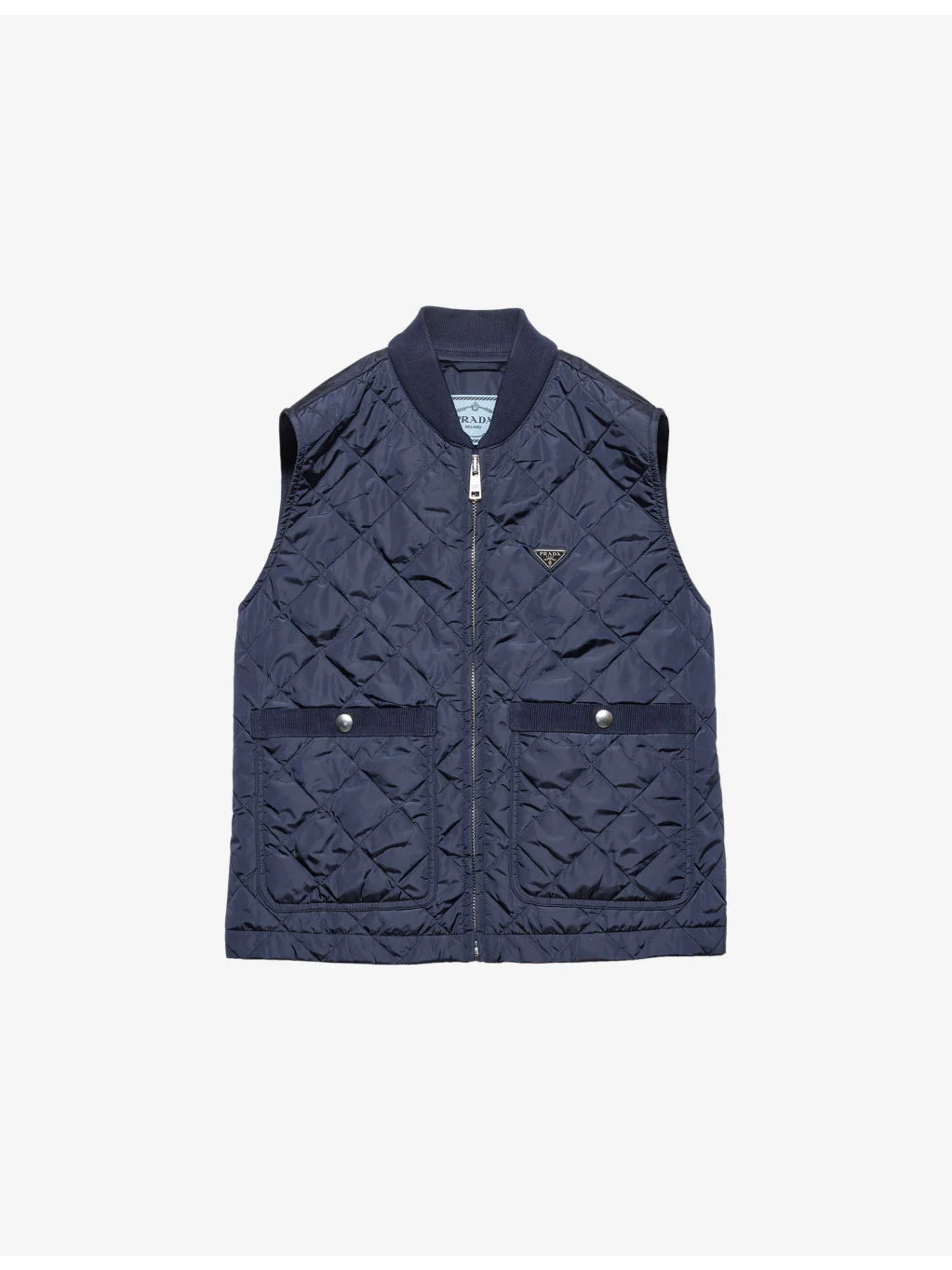 PRODUCT DETAILS - Prada shell vest - 100% polyamide - Exposed zip fastening at front - Regular fit, ribbed stand collar, sleeveless, quilted, enamelled metal triangle brand plaque, two snap-fastened patch pockets, velvet trim to pockets, unlined - Dry clean - Made in Italy - True to size - Model is 5ft 11in/1.80m and wears a size UK 6 - Midweight, non-stretch Ref: R04568436