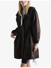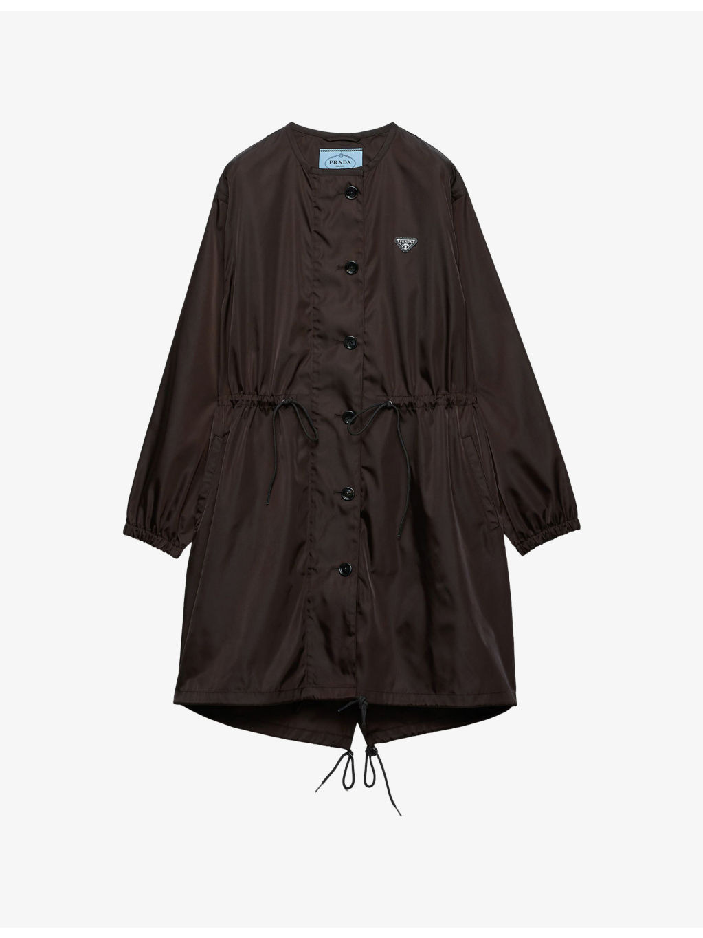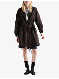 PRODUCT DETAILS - Prada nylon coat - 100% nylon - Zip fastening - Regular fit, drawstring hood, long sleeves, drawstring waist, pockets at front, branded hardware - Dry clean - Made in Italy - Model is 5ft 11in/1.80m and wears a size UK 6 - Lightweight, non-stretch Ref: R04509824