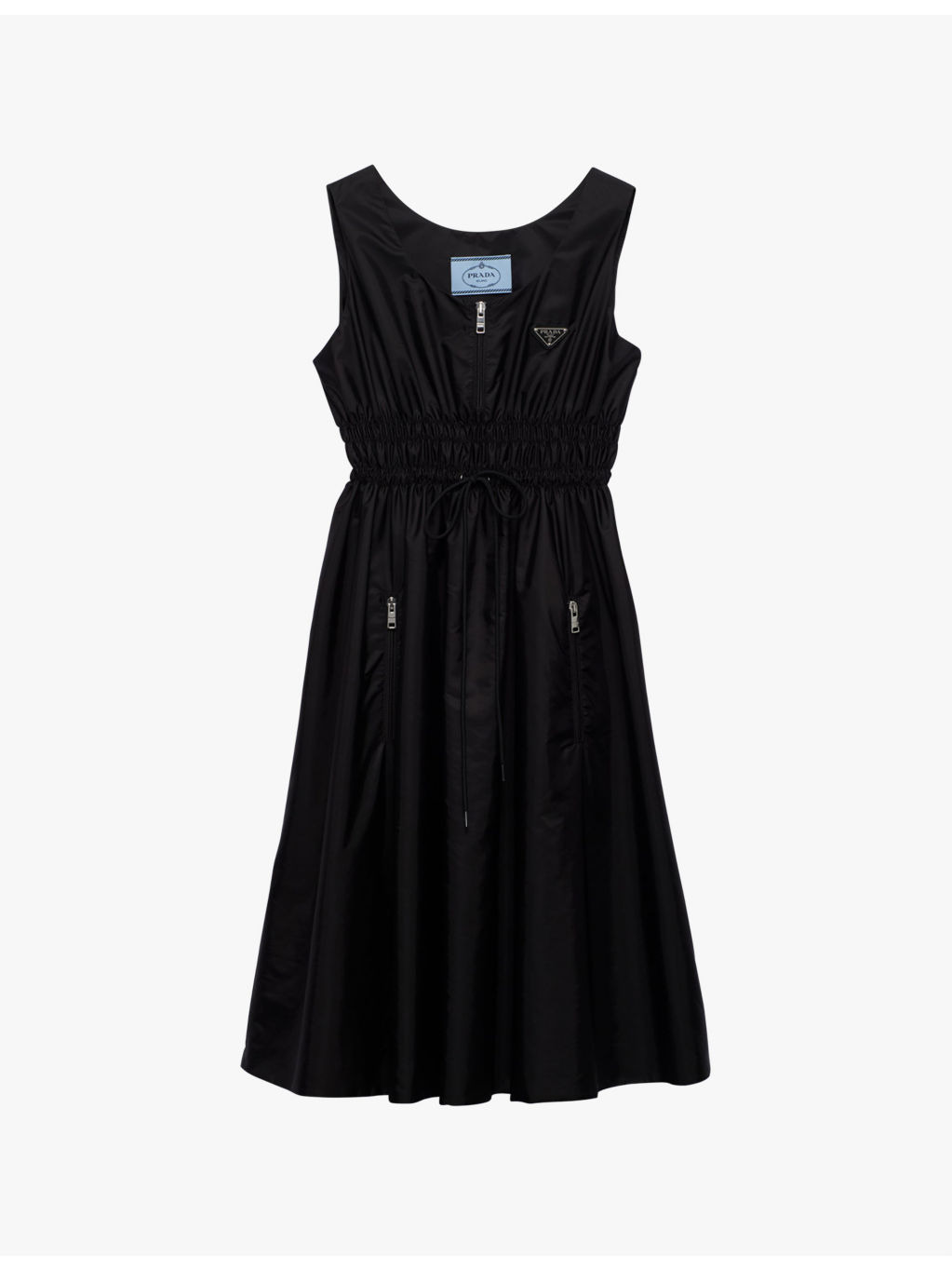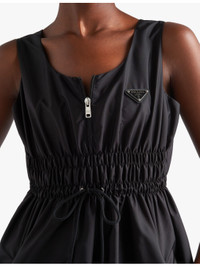PRODUCT DETAILS - Prada recycled-polyamide midi dress - 100% recycled polyamide - Zip fastening - Relaxed fit, sleeveless, scoop neck, front zip, enameled metal triangle logo, zipped pockets, drawstring on front, pleated skirt, midi length - Made in Italy - Size UK 8 = length 42.5in / 108cm - Model is 5ft 9in/1.75m and wears a size UK 6 - Lightweight, non-stretch Ref: R04333005