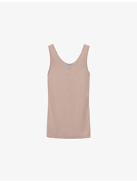 PRODUCT DETAILS - Prada cotton knit top - 100% cotton - Slips on - Slim fit, scoop neckline, sleeveless, brand plaque at front, ribbed texture - Machine wash cold - Model is 5ft 10in/1.78m and wears a size UK 8 - Lightweight, stretchy Ref: R04337642