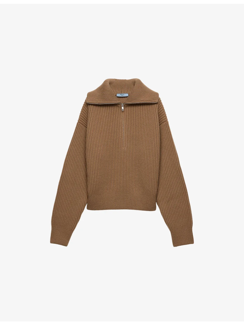 PRODUCT DETAILS - Prada cashmere jumper - 100% cashmere - Pulls on - Relaxed fit, funnel neck, half zip, long sleeves, rib-knit, large elbow patches, ribbed trims - Midweight, slight stretch - Please note, we are unable to accept in-store returns on Prada orders Ref: R04538274