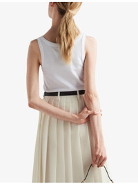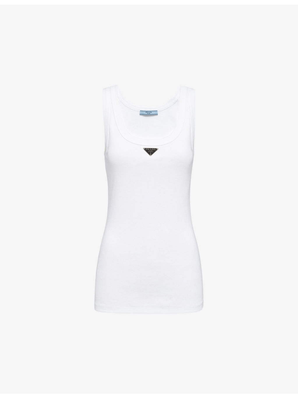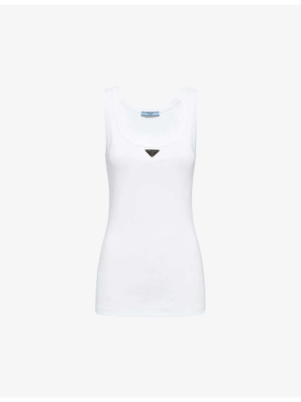 PRODUCT DETAILS - Prada cotton top - 100% cotton - Slips on - Slim fit, scoop neck, slim straps, sleeveless, all-over ribbed texture, brand-engraved plaque at chest - Dry clean - True to size - Lightweight, slight stretch Ref: R04268036