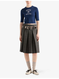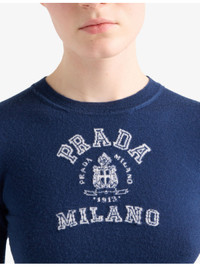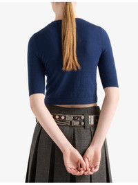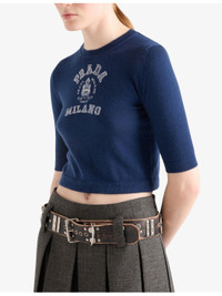 PRODUCT DETAILS - Prada cashmere top - 100% cashmere - Slips on - Slim fit, round neckline, short sleeves, brand intarsia at front, knitted, cropped, ribbed trims - Specialist dry clean - True to size - Midweight, slight stretch Ref: R04441823