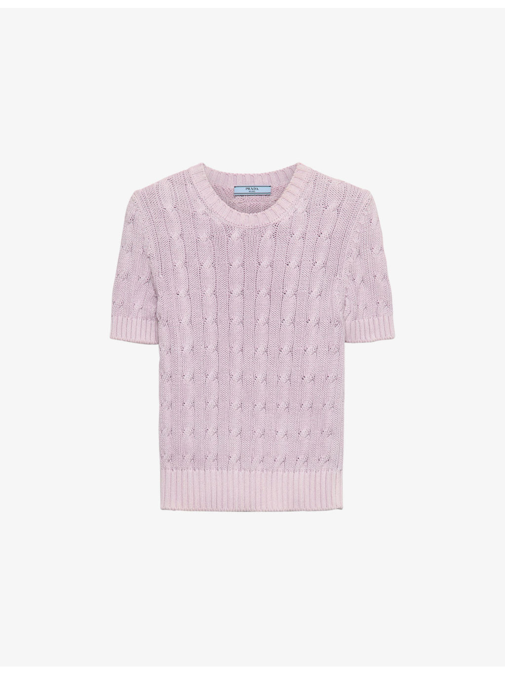 PRODUCT DETAILS - Prada cotton jumper - 100% cotton - Boxy fit, round neck, short sleeves, cable knit, ribbed trims, knit triangle logo and logo label - True to sizeModel is 5ft 8in/1.78m and wears a size UK 8 - Lightweight, slight stretch - Please note, we are unable to accept in-store returns on Prada orders Ref: R04452857