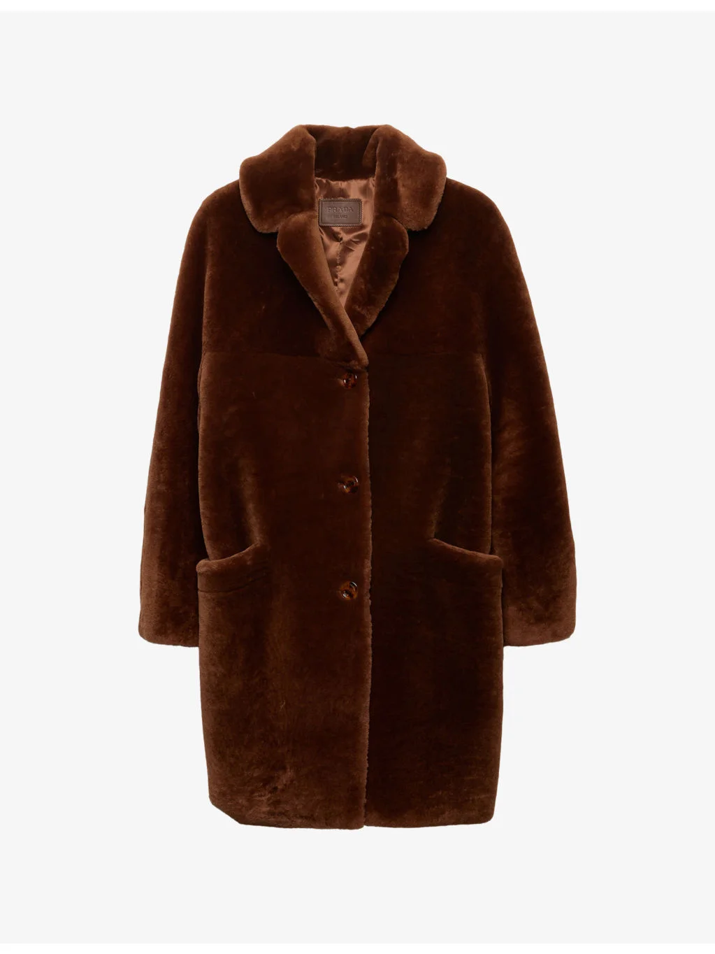 PRODUCT DETAILS - Prada shearling coat - 100% lambskin - Regular fit, notched lapels, long sleeves, slip pockets at front, brushed texture - Specialist leather clean - Made in Italy - Model is 5ft 11in/1.80m and wears a size UK 8 - Heavyweight, non-stretch Ref: R04568437