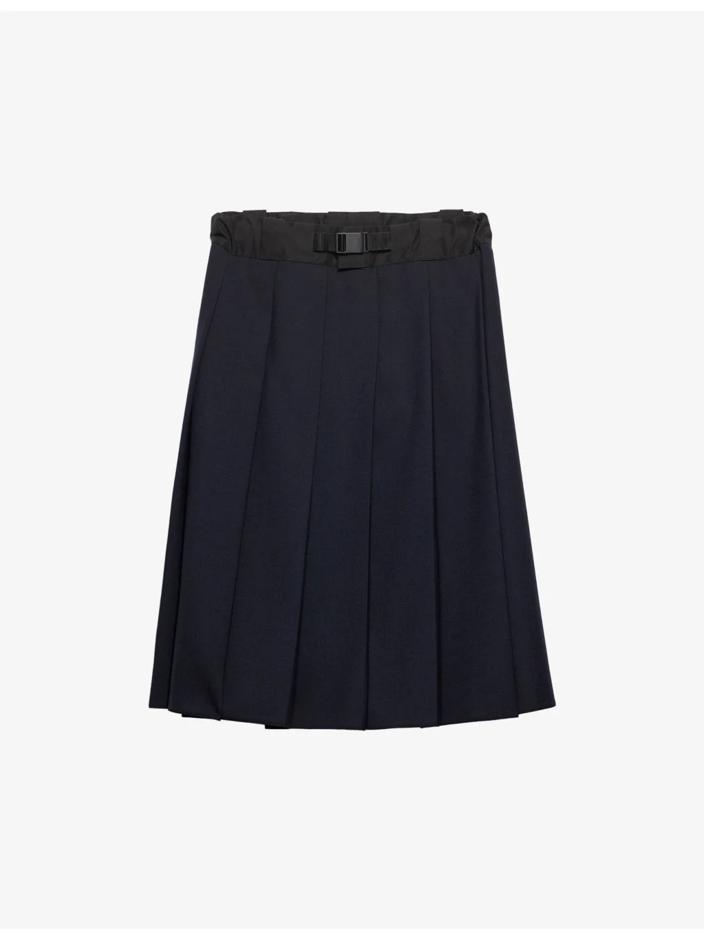 PRODUCT DETAILS - Prada wool midi skirt - 100% virgin wool; contrast 100% nylon - Concealed zip and snap fastening at front - High waist, shell panel at waistband, branded metal buckle, pleated, midi length - Dry clean only - Made in Italy - True to size - Model is 5ft 11in/1.80m and wears a size UK 6 - Midweight, non-stretch Ref: R04569046