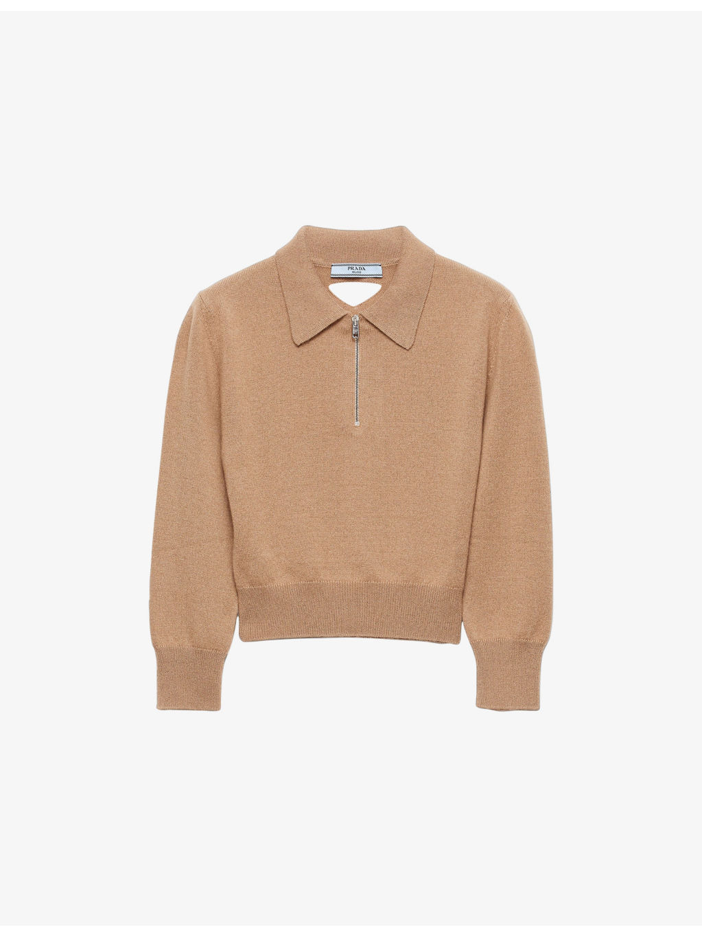 PRODUCT DETAILS - Prada cashmere jumper - 100% cashmere - Pulls on - Polo collar, short sleeves, ribbed trims, logo at back, straight hem - True to size - Midweight, slight stretch - Please note, we are unable to accept in-store returns on Prada orders Ref: R04525096