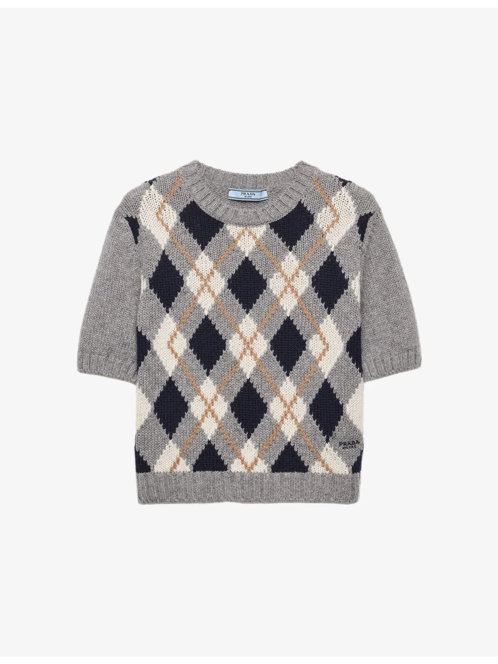 PRODUCT DETAILS - Prada cashmere jumper - 100% cashmere - Slips on - Slim fit, round neck, short sleeves, Jacquard knit, raglan shoulder, ribbed trims - Midweight, slight stretch - Please note, we are unable to accept in-store returns on Prada orders Ref: R04534020