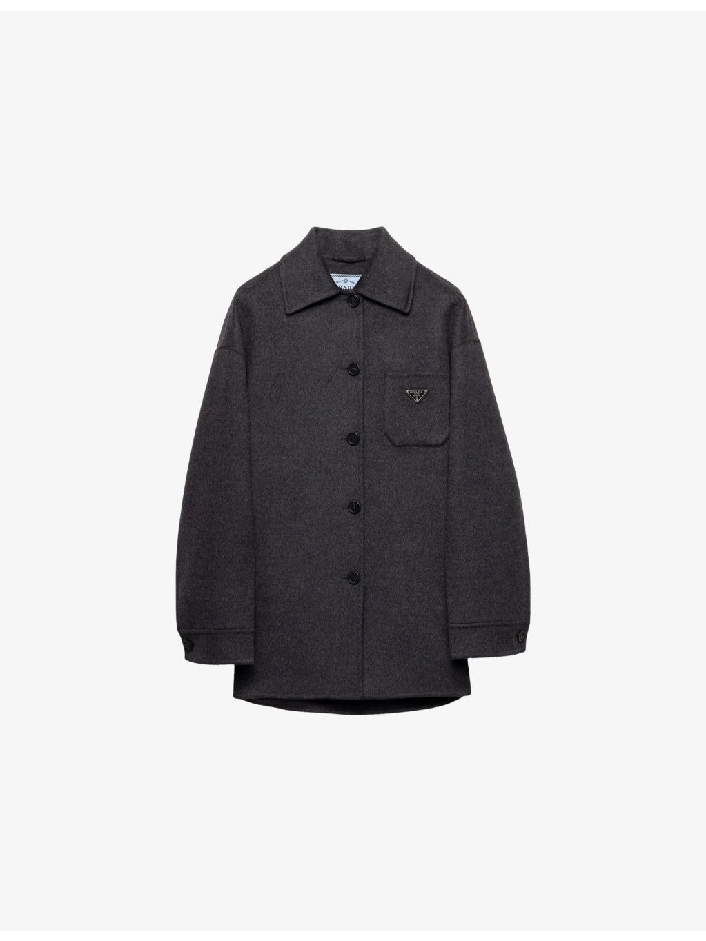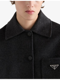 PRODUCT DETAILS - Prada cashmere-wool jacket - 80% wool, 20% cashmere - Button fastening - Oversized fit, collar, long sleeves, patch pocket at chest, triangle enamelled logo at patch pocket, pockets at front, brushed texture - Dry clean only - Made in Italy - Model is 5ft 11in/1.80m and wears a size UK 8 - Midweight, non-stretch Ref: R04520112