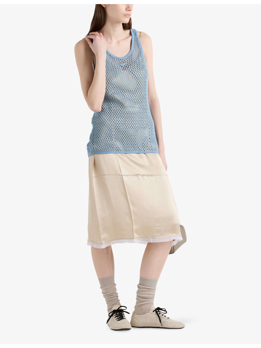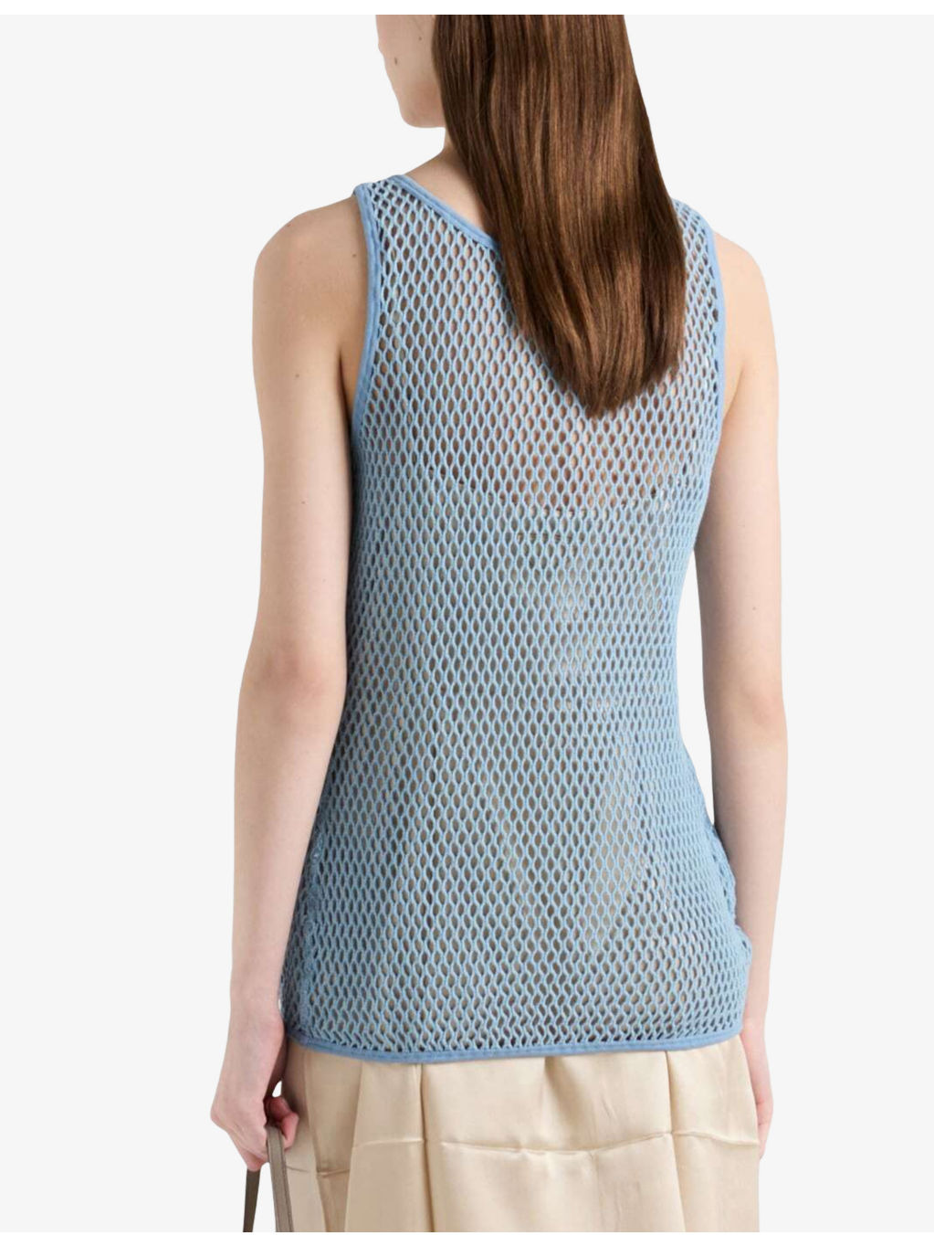 PRODUCT DETAILS - Prada cotton mesh top - 100% cotton - Regular fit, scoop neckline, sleeveless, triangle plaque at front, mesh open weave - Dry clean - Made in Italy - Model is 5ft 11in / 1.80m and wears a size UK 10 - Lightweight, slight stretch Ref: R04455420