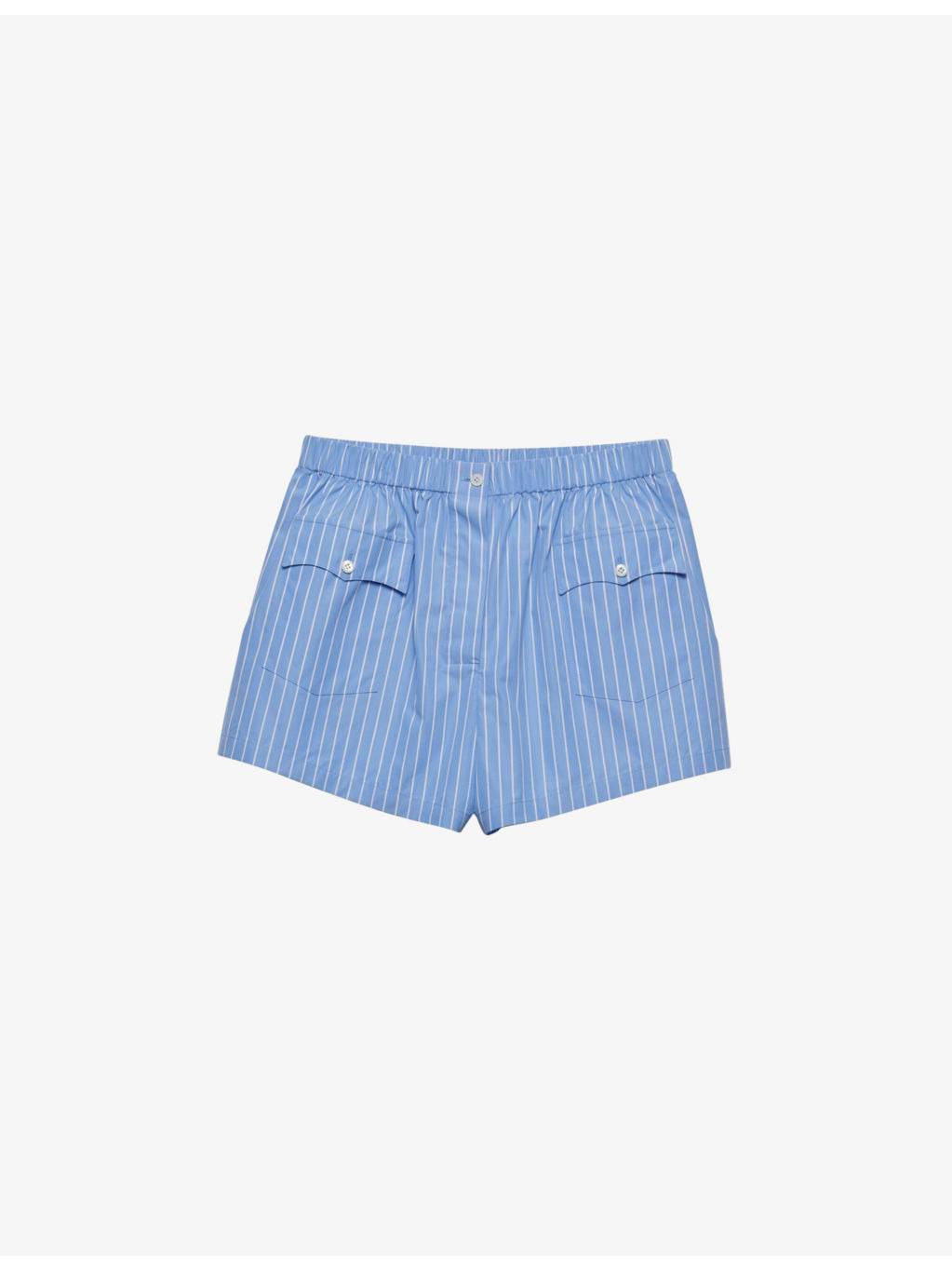 PRODUCT DETAILS - Prada cotton-poplin shorts - 100% cotton - Slips on - Relaxed fit, high rise, elasticated waist, two buttoned pockets at the front, all-over stripe pattern - Machine wash cold - True to size - Model is 5ft 10in/1.78m and wears a size UK 8 - Lightweight, slight stretch Ref: R04328407