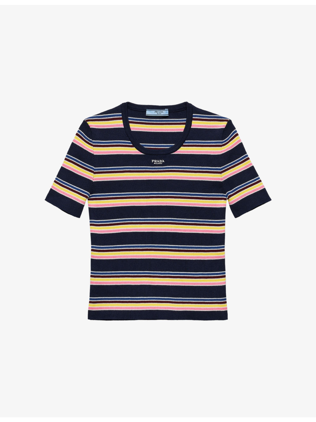 PRODUCT DETAILS - Prada cotton jumper - 100% cotton - Round neck, short sleeves, triangle logo at front, ribbed trims, striped - True to size - Model is 5ft 10in/1.78m and wears a size UK 8 - Lightweight, stretchy - Please note, we are unable to accept in-store returns on Prada orders Ref: R04475670
