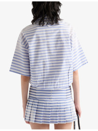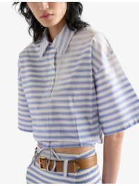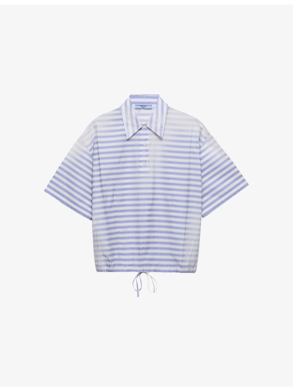 PRODUCT DETAILS - Prada cotton shirt - 100% cotton - Button fastening - Loose fit, polo shirt collar, short sleeves, fabric triangle logo, straight tied hem, unlined - True to size - Model is 5ft 9in/1.75m and wears a size UK 8 - Lightweight, non-stretch - Please note, we are unable to accept in-store returns on Prada orders Ref: R04448721