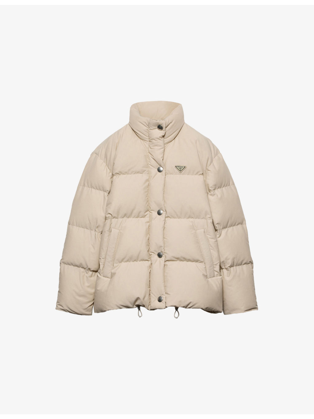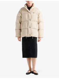 PRODUCT DETAILS - Prada cotton-blend down jacket - 55% cotton, 45% polyamide - Zip fastening - Regular fit, stand collar, long sleeves, triangle enamelled logo at chest, angled slip pockets at front, padded - Dry clean only - Made in Italy - True to size - Model is 5ft 11in/1.80m and wears a size UK 8 - Heavyweight, non-stretch Ref: R04494613