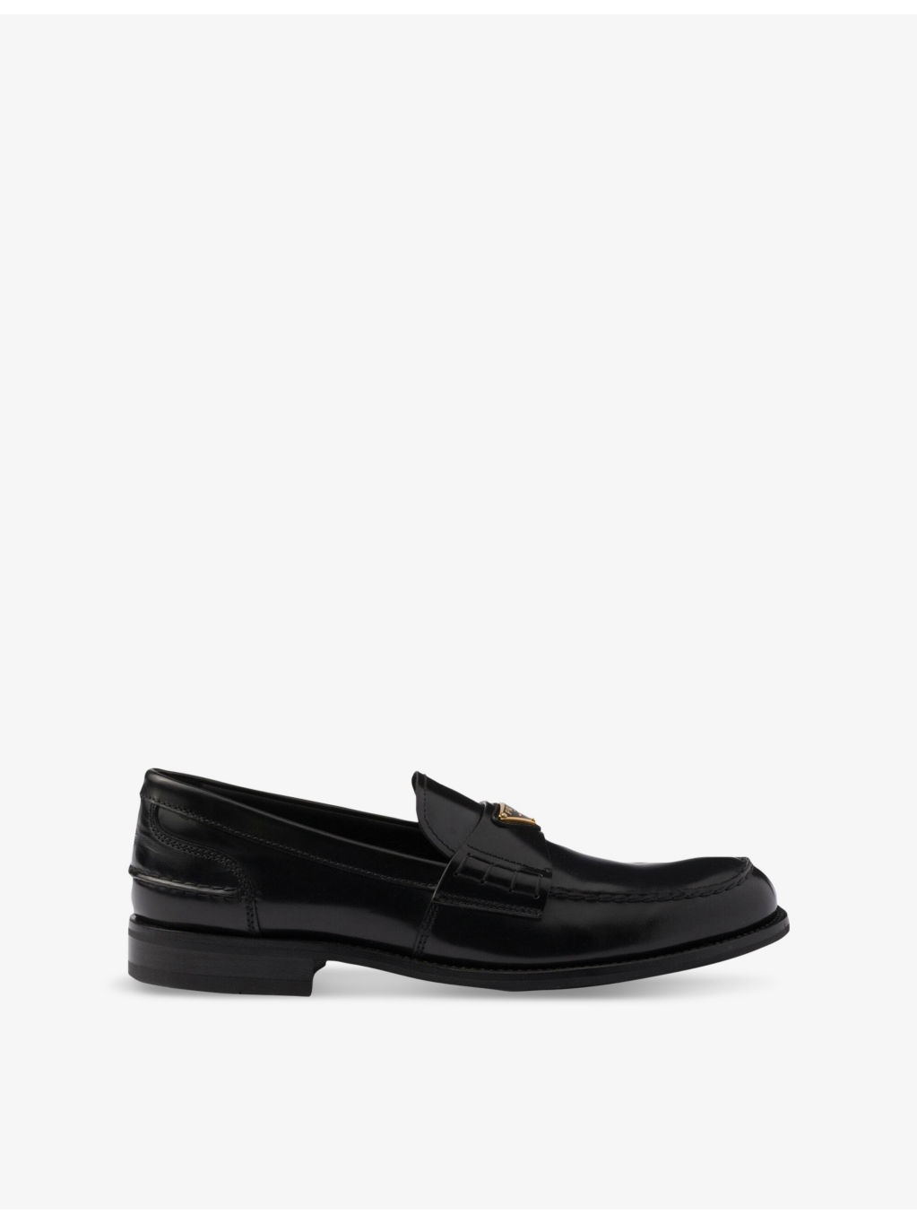 PRODUCT DETAILS - Prada leather loafers - 100% leather - Slips on - Round closed toe, enamelled metal triangle logo plaque at front, tonal stitching, branded insole, low block heel, brushed finish - Specialist leather clean - Made in Italy - Upper: 100% leather - Lining: 100% leather - Sole: 100% leather Ref: R04422619