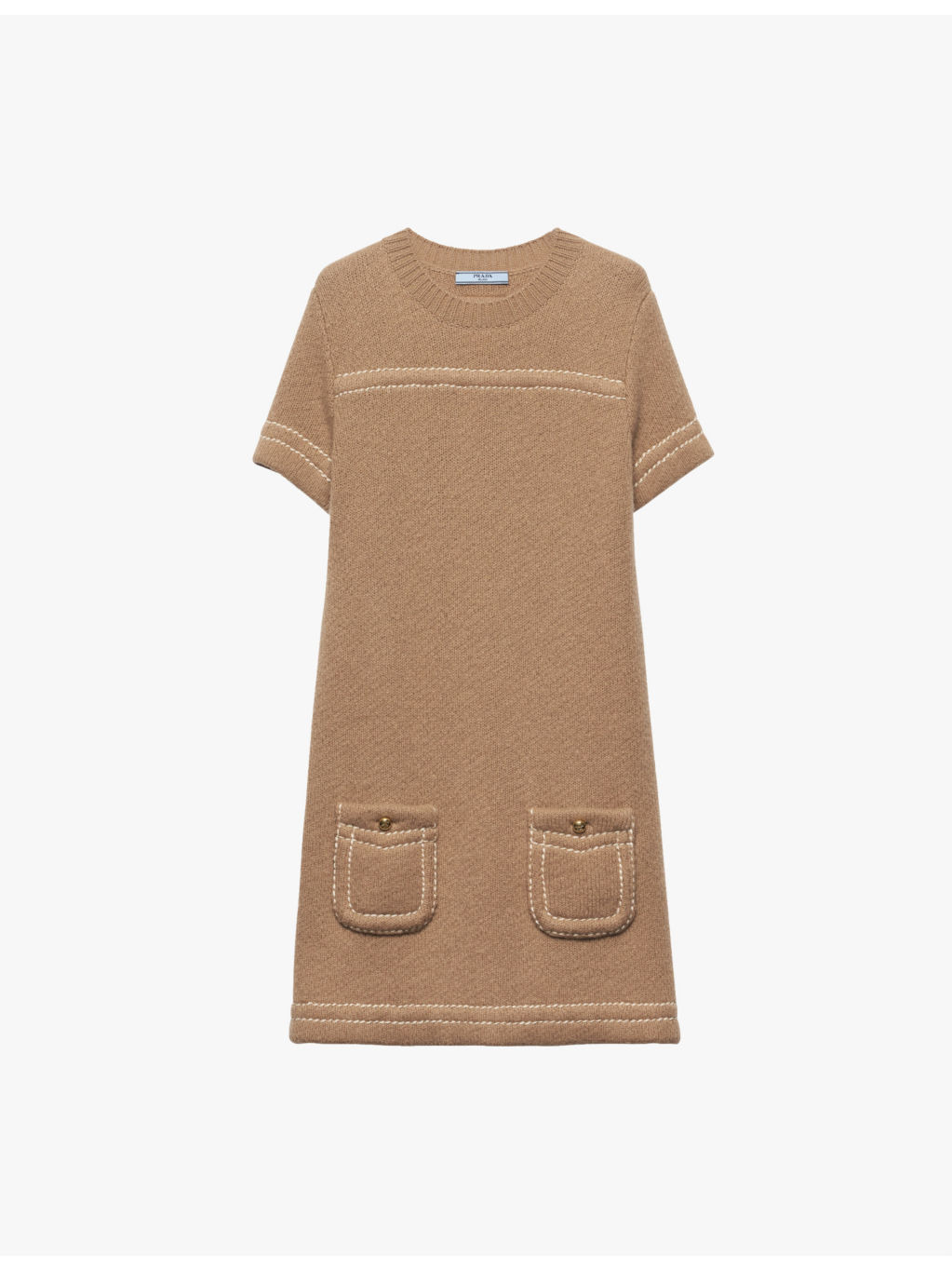 PRODUCT DETAILS - Prada cashmere knitted mini dress - 100% cashmere - Slips on - Regular fit, round neck, short sleeves, pockets at front, triangle logo at back, soft A-line shape, brushed knit texture - Dry clean only - Model is 5ft 10in/1.78m and wears a size UK 8 - Lightweight, stretchy Ref: R04373143