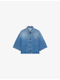 PRODUCT DETAILS - Prada denim shirt - 100% cotton - Button fastening - Classic fit, collar, short sleeves, enamelled triangle logo at chest, vintage faded wash, contrast stitching, cropped - Dry clean - Made in Italy - Model is 5ft 11in/1.80m and wears a size UK 6 - Midweight, non-stretch Ref: R04504186