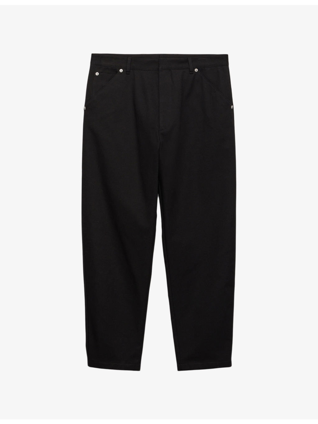 PRODUCT DETAILS - Prada cotton trousers - 100% cotton - Button and zip-fly fastening - Relaxed fit, mid-rise, tapered leg, structured waistband with belt loops, slip pockets at front, welt pockets at back, triangle enamelled plaque at back pocket, branded hardware - Machine wash cold - Model is 6ft 2in/1.88m and wears a size UK 30 - Midweight, non-stretch Ref: R04388813