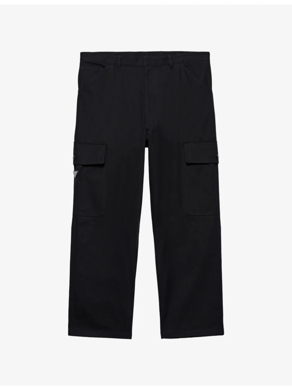 PRODUCT DETAILS - Prada cotton trousers - 100% cotton - Button and zip-fly fastening - Regular fit, mid-rise, wide leg, structured waistband with belt loops, slip pockets at front, flap pockets at side, enamelled triangle logo at pocket, woven texture - Machine wash cold - Model is 6ft 2in/1.88m and wears a size UK 40 - Midweight, non-stretch Ref: R04430192