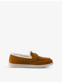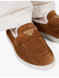 PRODUCT DETAILS - Prada suede and shearling loafers - 100% suede; contrast 100% lamb shearling - Slips on - Slip-on style, round closed toe, enamelled metal triangle logo at top, tonal stitching, flat sole, branded insole, shearling lining - Specialist leather clean - Upper: 100% suede - Lining: 100% shearling - Sole: 100% rubber Ref: R04375666