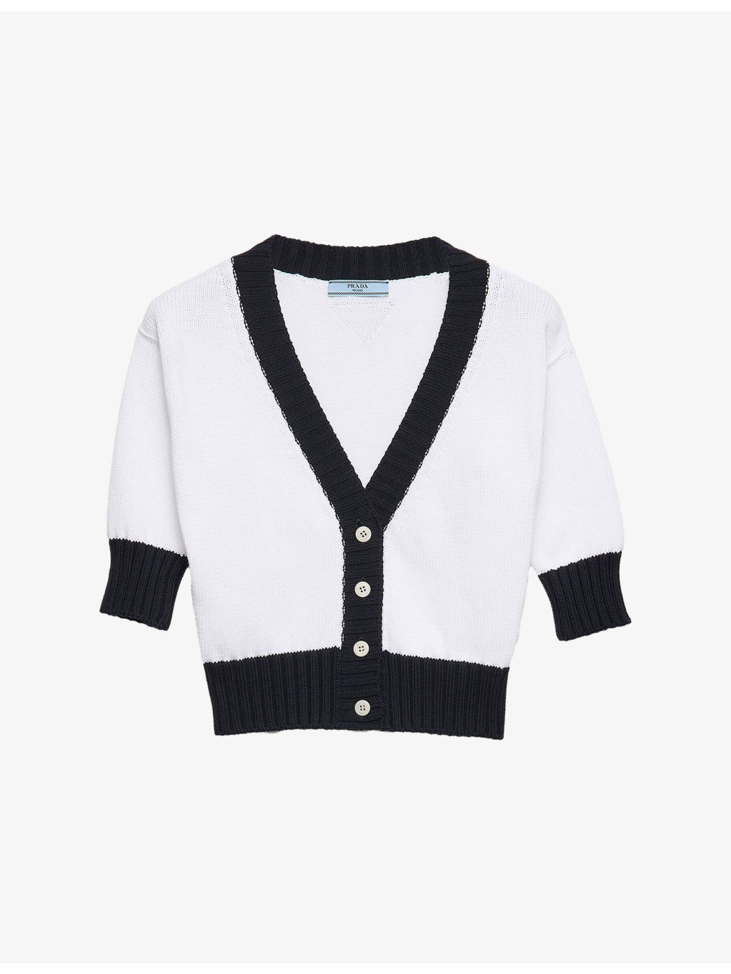 PRODUCT DETAILS - Prada cotton-knit cardigan - 100% cotton - Button fastening - Regular fit, V-neck, short sleeves, fitted trims, contrast trims, cropped - Hand wash - True to size - Model is 5ft 10in/1.78m and wears a size UK 8 - Midweight, slight stretch Ref: R04456688