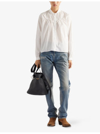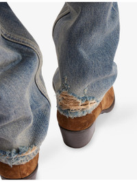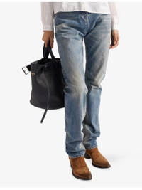 PRODUCT DETAILS - Prada denim jeans - 100% cotton - Button and zip-fly fastening - Regular fit, mid-rise, tapered leg, structured waistband with belt loops, five pockets, brand patch at back, vintage wash, distressed detailing, branded hardware - Dry clean only - Made in Italy - True to size - Model is 5ft 10in/1.78m and wears a size 26 - Midweight, non-stretch Ref: R04486679