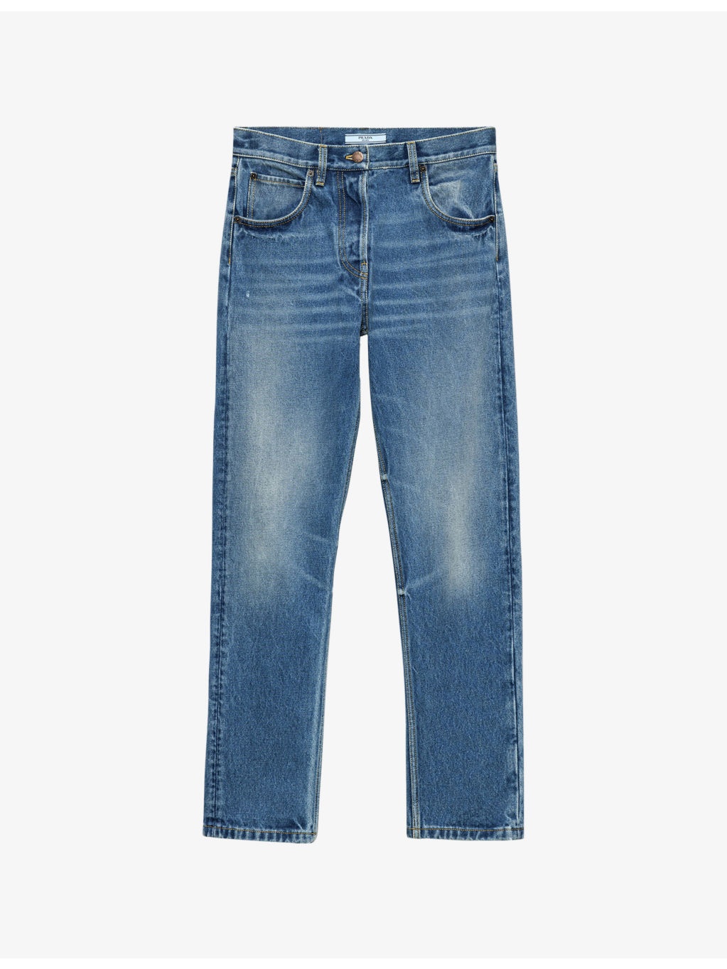 PRODUCT DETAILS - Prada denim jeans - 100% cotton - Button and zip-fly fastening - Straight-leg, mid-rise, structured waistband, belt-loops, classic five pockets, contrast topstitch, all-over wash effect - Machine wash cold - Made in Italy - Model is 5ft 10in/1.78m and wears a size UK 6 - Midweight, non-stretch - Please note, we are unable to accept in-store returns on Prada orders Ref: R04464759