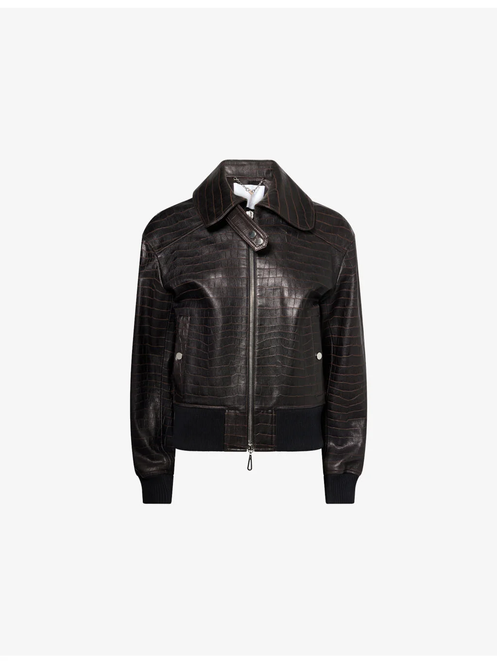 PRODUCT DETAILS - Rabanne leather jacket - 100% cow leather - Zip fastening - Regular fit, collar, long sleeves, pockets at front, croc-effect design, branded hardware, ribbed trims, lined - Specialist leather clean - Made in Turkey - True to size - Model is 5ft 10in/1.78m and wears a size UK 8 - Heavyweight, non-stretch Ref: R04551229