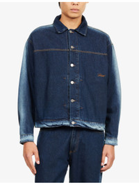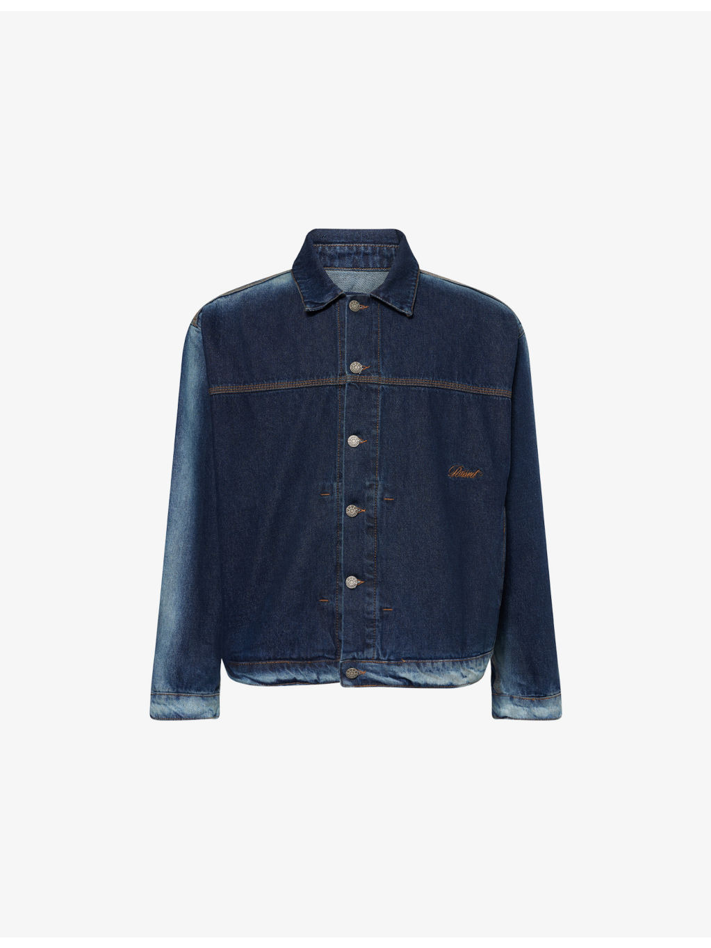 PRODUCT DETAILS - Rassvet denim jacket - 100% cotton - Exposed button fastenings at front - Relaxed fit, pointed collar, long sleeves, buttoned cuffs, logo embroidered at front, brand patch embroidered at back, faded effect, dark wash, branded antique-silver hardware, contrast stitching - Machine wash cold - Made in Portugal - Size medium: length 26in / 66cm, chest 44in / 112cm - Model is 6ft 2in/1.88m and wears a size medium - Midweight, non-stretch Ref: R04513392