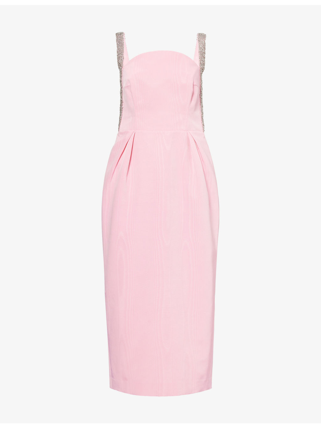 PRODUCT DETAILS - Rebecca Vallance crepe midi dress - 100% polyester; lining 97% polyester, 3% elastane - Concealed zip fastening at back - Regular fit, curved strapless neckline, diamante-embellished straps, internal boning, two side slip pockets, tulle embroidery at sides, low scoop back, tulip shape, mini length, fully lined - Dry clean only - True to size - Size UK 8: length 48in / 122cm - Model is 5ft 10in/1.78m and wears a size UK 8 - Midweight, non-stretch Ref: R04552322